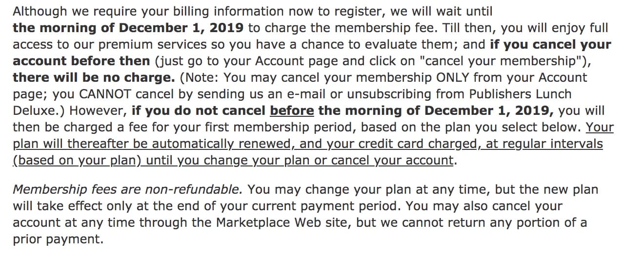 A subscription to Publishers Marketplace costs $25 a month. Here’s the fine print for the free trial.