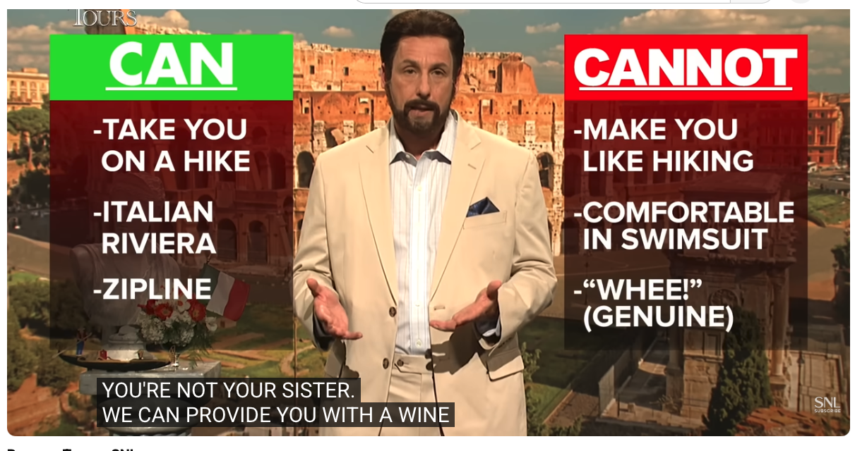 Like this old Adam Sandler SNL Romano Tours bit says, a vacation can take you on a hike. It cannot make you like hiking. A writers retreat can give you time to write. It cannot MAKE you write.