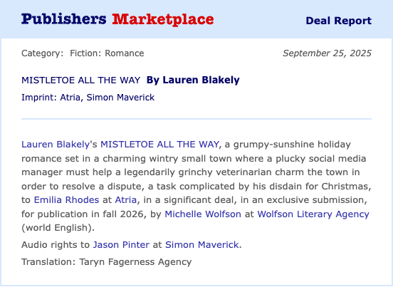 So what can you learn from this deal? That a big-five editor bought a holiday-themed contemporary romance from a highly successful author with a great agent. By itself, this one deal is not helpful in studying the market or planning your career. And that's ok! No one should take one piece of information and plan their whole career around it. Studying the deals section, however rigorously you want, can help you get a general sense of what's going on in publishing today. You're not going to remember everything you read. You're not going to absorb every possible insight. But if you make a point to keep up on things (if that's helpful to you, your process, your career, your practice–and it may not be!!!) you'll have a moment down the line when you get an idea and think hmm, I saw something somewhere about... and you look it up and there's a tidbit that unlocks something that helps and takes you one step toward your goals. This is how all study, research, practice, etc works. You don't have to rattle off stats or "nice deal" numbers or whatever to prove you've done enough homework to be "better" at publishing. No one has time for all that, even me! But investing some time in the study of the industry you want to be a part of can help, even if it's just reading the deal announcements every once in a while.