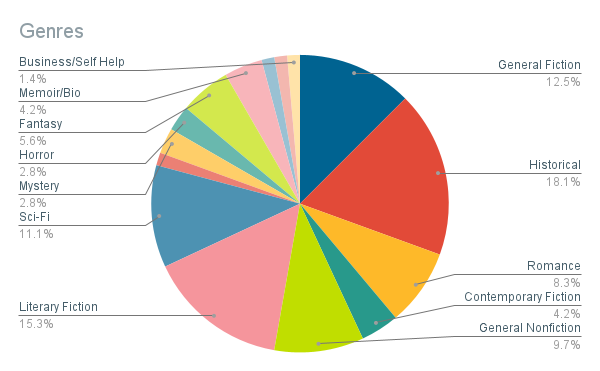 Last but not least, here are all the genres I read in 2025. Look at all those nice slices of pie! Obviously, some things are hard to categorize. What you might call General Fiction someone else might call Contemporary, but whatever. Genres are a construct and I make the rules for these charts. I can't believe I actually read a mystery (eh) and a thriller (👍) this year! Next year, I want to read more Romance, Fantasy, and Horror, for business and for pleasure. Also, you're welcome for me personally keeping the historical fiction market afloat. This is my favorite genre and I intend to do my part to keep it going.