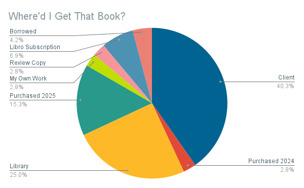 Sorta related to the above is my Where'd I Get That Book? chart, because, as you can see, 40% of my books came from my clients, which means they're mostly manuscripts, or sometimes a galley when I'm re-reading a final version. Work! I was also interested to track this year how many books I read from my own collection (in part represented by Purchased 2024) and how many newly purchased books I actually read from 2025. I could have also tracked what I bought in 2025 vs what I read on this spreadsheet but I love myself too much to look at those numbers. When I was compiling this chart, I thought oh good, this year won't have my own book on it because it was published this year! (I read my book eight times through in 2024.) Nope, lol. I read my book twice this year–once for the final, final, final read through and once while I recorded the audiobook. (Yes, that counts.) Here's to not reading my own book again in 2026!!!!! And those Borrowed books represent the several times this year I actually read the books my husband recommended to me, after 11 years of marriage, and those are from his collection. (We are Separate Book Collections household.) Because so much of my life is reading what I have to read for other people, I find it hard to read books that someone says oh you have to read this, even my very smart and very well-read husband. Turns out, it's fun to read the same book as your favorite person so you can talk about it! This is just me being stubborn for the last decade or so. Sorry, Josh. I'll let you know what I think about A Marriage At Sea when I'm done with it in a week or so.