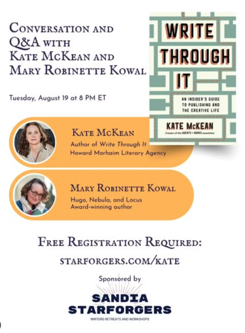 First! TONIGHT! Tuesday, August 19th, 8pm ET, I will be speaking with the one and only Hugo, Locus, and Nebula award-winning author Mary Robinette Kowal about WRITE THROUGH IT and also we will be taking questions! It’s a virtual event so anyone can come and it’s FREE!